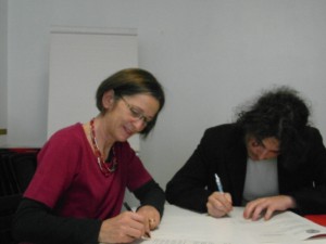Très concentré Hugo signe sa convention d’intégration avec la gérante de Coodyssée.