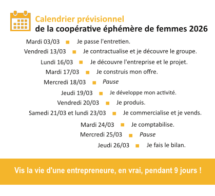 En 10 jours, un groupe de femmes va apprendre à se connaître, créer une entreprise, fixer leur prix et calculer leur prévisionnel, réaliser leur communication et leur marketing, produire, vendre puis arrêter l’activité et en faire le bilan.